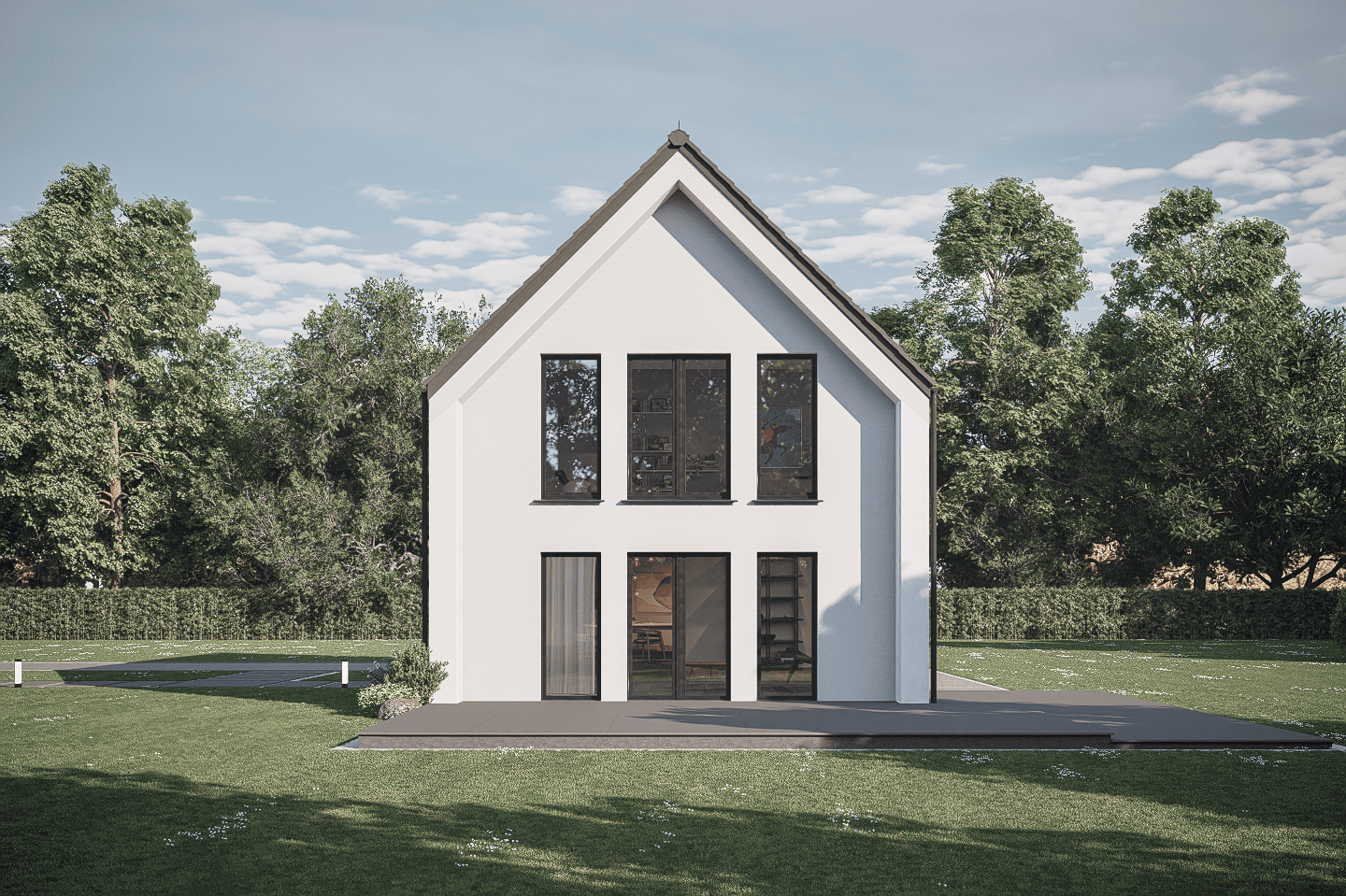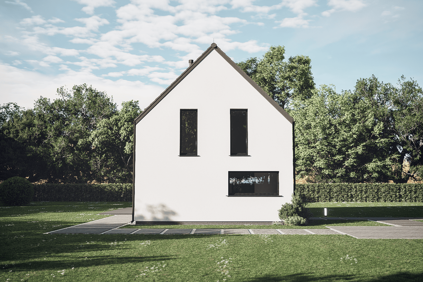 Dwukondygnacyjna bryła w stylu nowoczesnej stodoły łączy pionową dynamikę z prostą, zwartą formą. Dach dwuspadowy bez okapów podkreśla minimalistyczny charakter budynku i ogranicza mostki termiczne — kluczowe przy dwóch kondygnacjach. Czytelna sylwetka dobrze wpisuje się zarówno w miejskie parcele, jak i w podmiejskie otoczenie z większą działką.