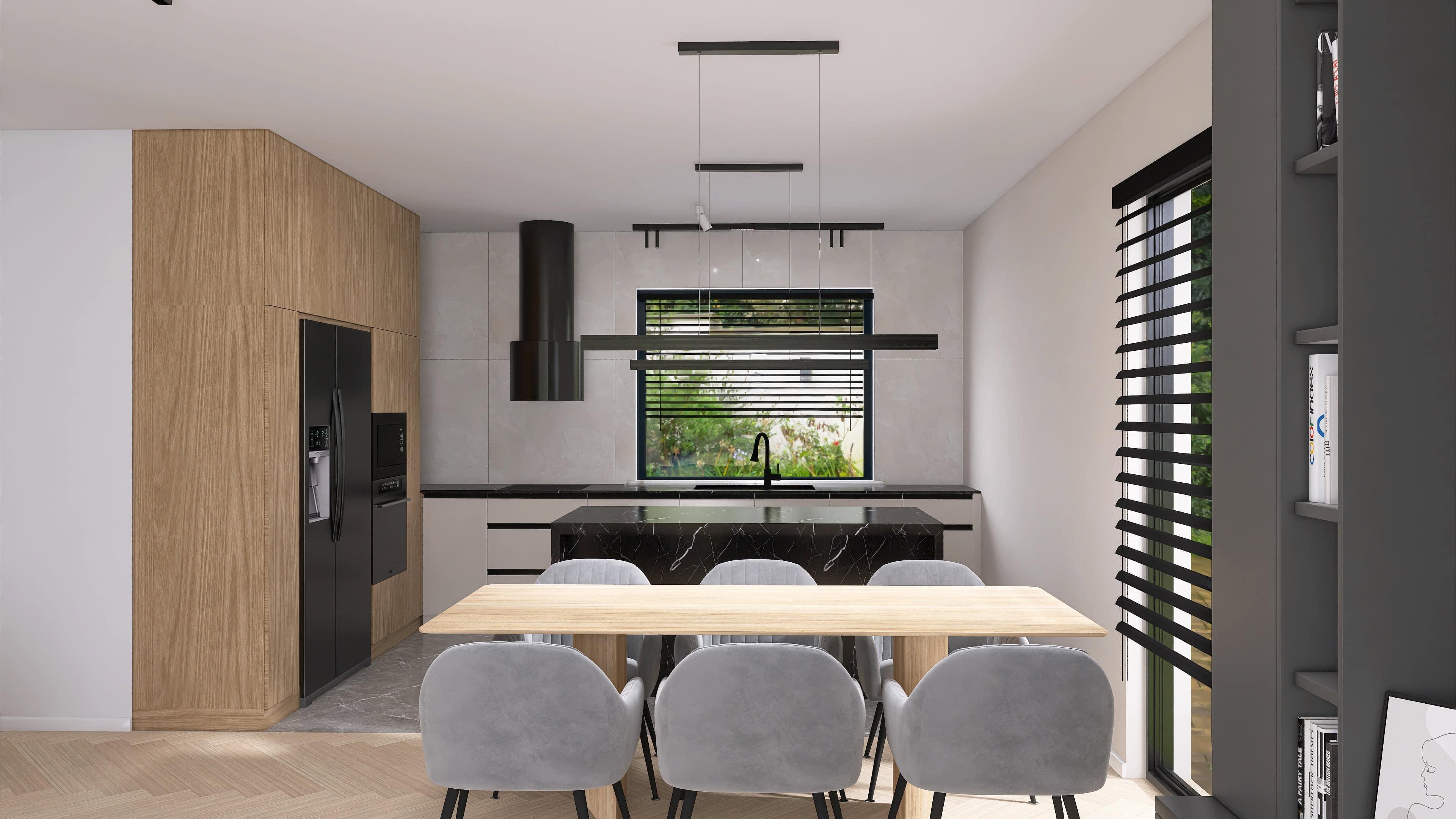 To największa strefa dzienna w całej rodzinie m90 — otwarta przestrzeń, gdzie gotowanie, jedzenie i odpoczynek naturalnie przenikają się nawzajem. Wyspa kuchenna wyznacza granicę między strefami, nie zamykając ich — możesz rozmawiać z gościem przy stole, stojąc przy kuchence. Bez problemu zmieścisz tu kanapę narożną, stół jadalniany i osobną strefę do pracy.
