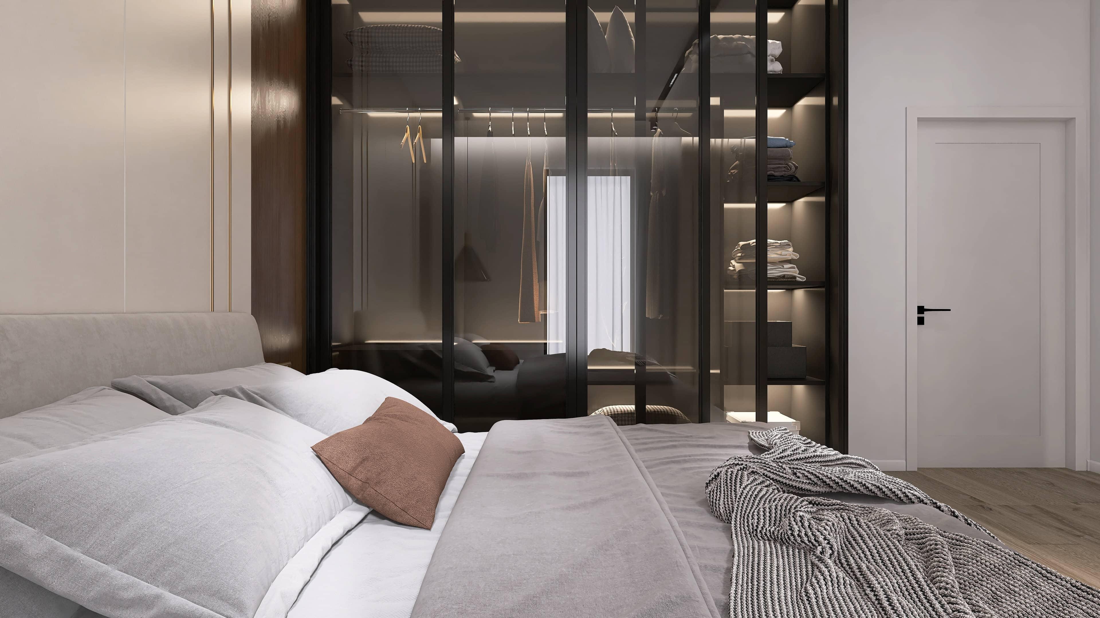 Sypialnia główna to spokojne, prywatne miejsce z pełnym zapleczem do przechowywania. Wbudowana garderoba eliminuje potrzebę szafy w sypialni — możesz urządzić ją minimalnie, z dużym łóżkiem, lampką i ulubioną książką. Tyle wystarczy, żeby naprawdę odpocząć.