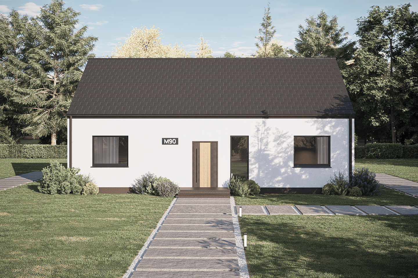 Dom o powierzchni użytkowej około 90 m² zaprojektowany z myślą o parze lub singlach ceniących przestrzeń i porządek. Dwie dobrze zaplanowane sypialnie, imponująca strefa dzienna z wyspą kuchenną i własna garderoba — to układ, który daje realny komfort bez przesadnego metrażu do utrzymania.