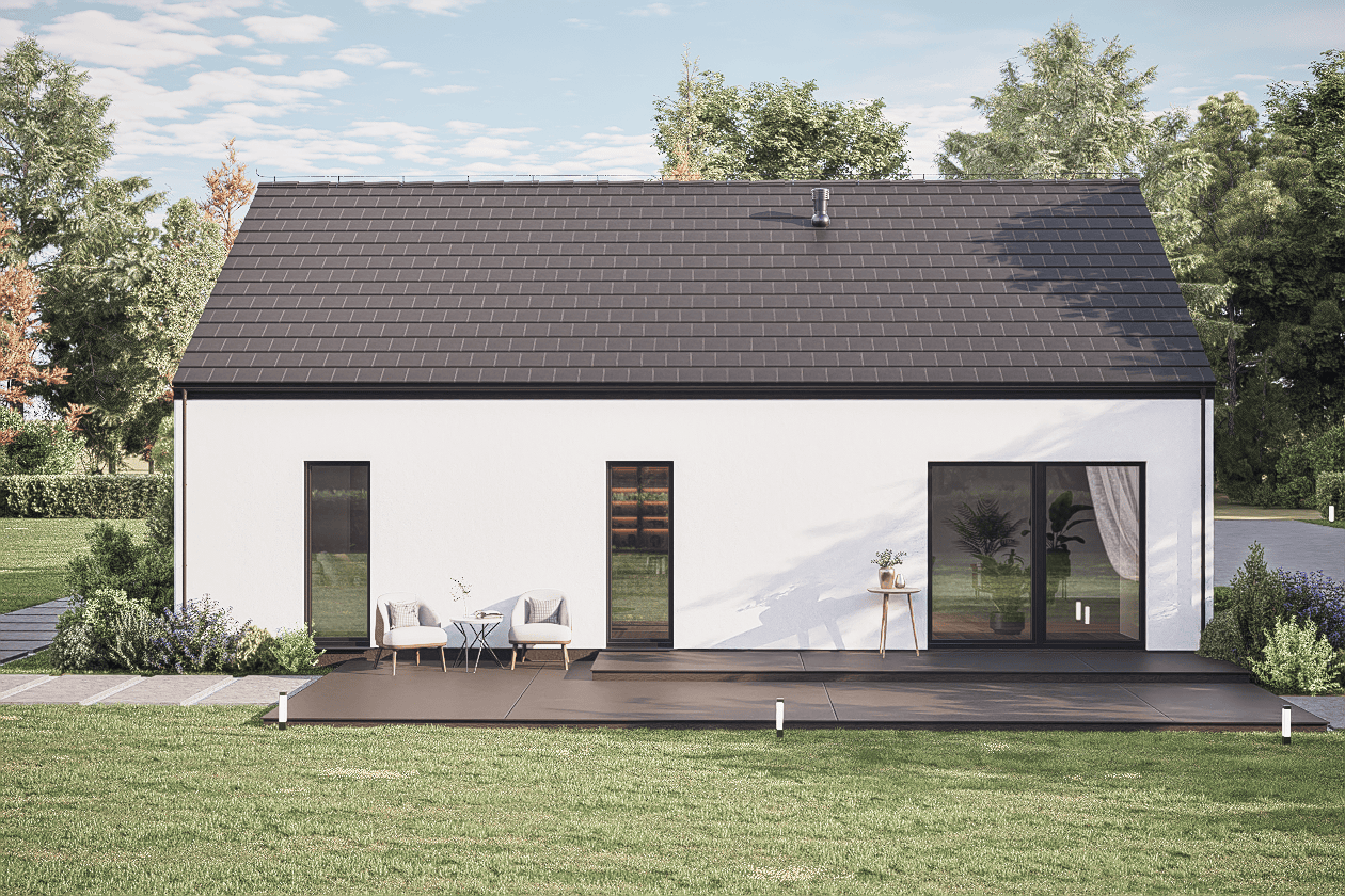 Parterowa bryła inspirowana nowoczesną stodołą to jedna z najbardziej efektywnych form architektonicznych — prosta w budowie, łatwa w utrzymaniu i ponadczasowa w wyglądzie. Dach dwuspadowy bez okapów podkreśla minimalistyczny charakter budynku i ogranicza mostki termiczne. Niska, zwarta sylwetka wpisuje się naturalnie zarówno w działkę miejską, jak i otwarte podmiejskie otoczenie.