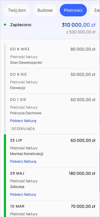 Tak. Panel pokazuje wszystkie transze płatności powiązane z konkretnymi etapami budowy.